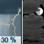 Mostly cloudy.A medium(50%) chance of showers and thunderstorms in the east grading to a slight(20%) chance in the west clearing by night.Light winds.